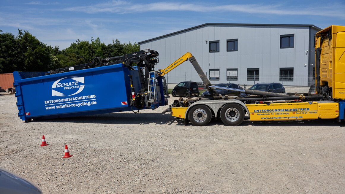 Schultz Recycling GmbH implemented an eye-catching transport solution for its own fleet. Based in Kropp, the company specializes in metal collection and recycling in Schleswig-Holstein. Two of the three PALFINGER roll-off tipper trucks feature extra equipment. In addition to DIN 30722 containers, the identical trucks can load a special container with a permanently mounted EPSILON Q170 L 95 Triple Recycling Crane. The crane container can be picked up and operated from both sides with the roll-off tipper. Depending on requirements, the truck drives to the job with the recycling crane mounted at the rear or behind the cab.